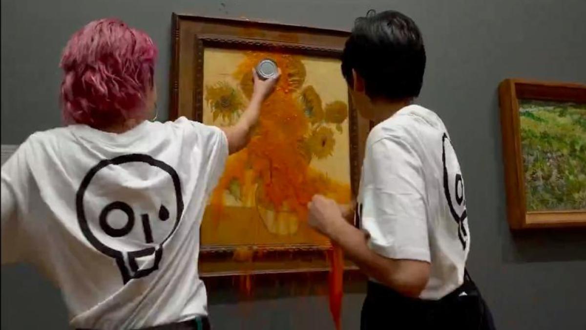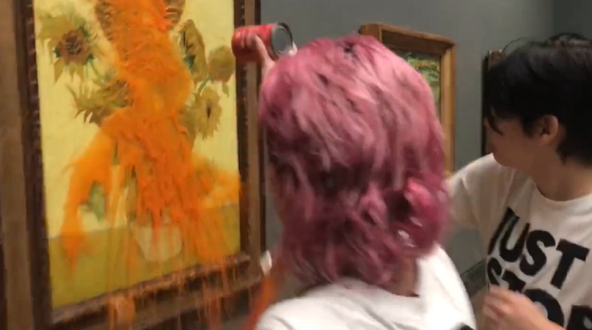 Des militants écologistes du mouvement Just Stop Oil ont mené une action à la National Gallery de Londres. Deux membres du collectif ont jeté de la soupe à la tomate sur le chef-d’œuvre de Vincent Van Gogh, les « Tournesols », avant de se coller au mur.
