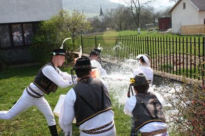 Ce jour donc, les hommes aspergent également les femmes d'eau et de parfum, en leur souhaitant Amour, Santé et Beauté pour l'année. Pour les remercier, les femmes leur offrent un petit verre d'alcool, en général du Vajčový koňak (liqueur aux oeufs), des oeufs en chocolat ou décorés (les Kraslice), pour représenter le Renouveau, la Vie après la mort, et un peu d'argent de poche pour les plus jeunes.
