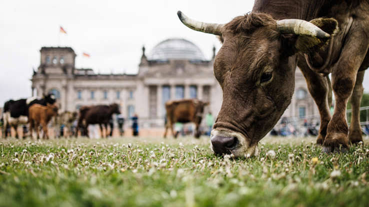 En collaboration avec l'Arbeitsgemeinschaft baeuerliche Landwirtschaft (groupe de travail pour l'agriculture rurale), l'organisation de protection de l'environnement Greenpeace a organisé une manifestation en laissant des vaches paître sur la pelouse devant le parlement allemand.