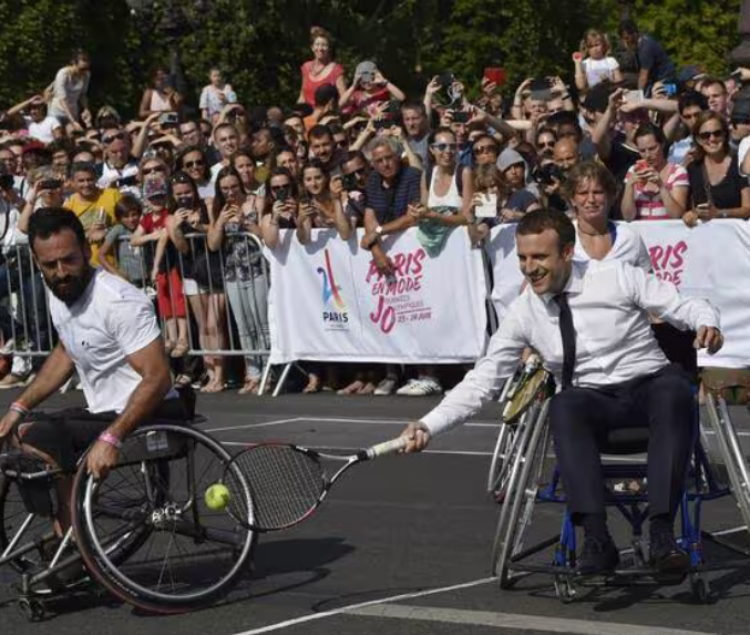 En costume et cravate malgré la chaleur, le président de la République s’est mis dans la peau des athlètes sur le court de tennis installé sur le pont Alexandre III pour le week-end par le comité de candidature de Paris 2024. L’occasion de mouiller la chemise sous les yeux de nombreux spectateurs.