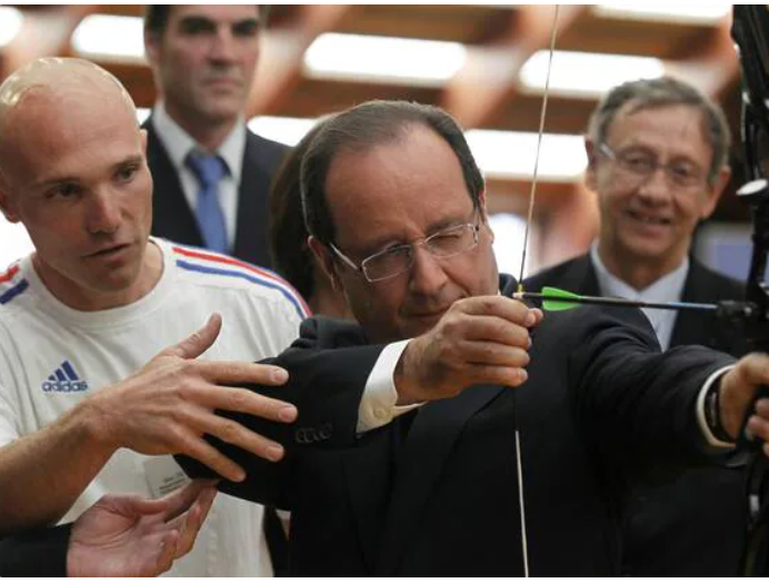 Le Président de la République, François Hollande s’est rendu à l’institut national du sport à Vincennes le 11 juillet 2012 pour soutenir les athlètes français à dix jours de l’ouverture des Jeux olympiques 2012 à Londres. Le chef de l’État a débuté sa visite par le badminton, le tennis handisport, puis le tir à l’arc. Une initiation sportive diverse et variée.