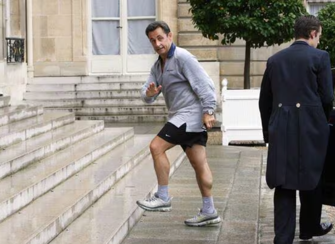 Lors de son mandat présidentiel (2000è-2012), Nicolas Sarkoky s’adonnait à des footings « réguliers ». Cette photo de mai 2007 le montre au premier jour de sa présidence, remontant le perron de l’Elysée après un jogging. Le pas rapide jusqu’à l’entrée dans l’Elysée. Une photo très marquante car inédite.