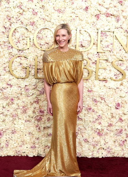 Sur le tapis rouge, cascade de tenues glamourissimes et de paillettes. En course pour le titre de meilleure actrice dans une mini-série pour « Disclaimer », Cate Blanchett était resplendissante dans sa sublime robe dorée brodée de cristaux signée Louis Vuitton, une version upcyclée et upgradée de la robe, qu’elle avait portée au Festival de Cannes pour la première du film « Rumeurs » en mai dernier.