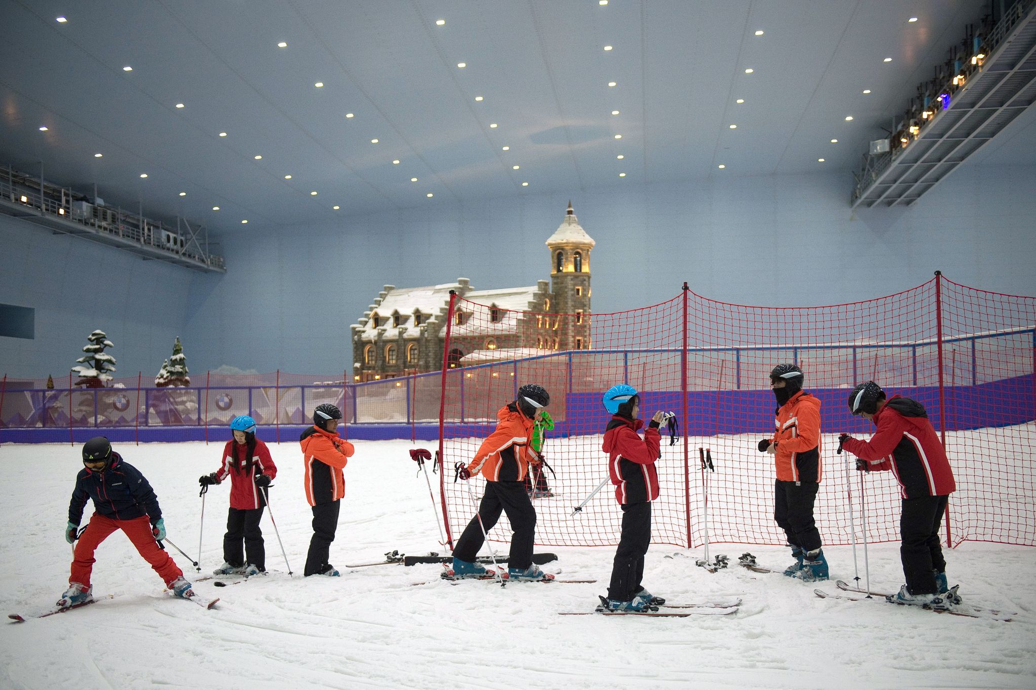 Cette infrastructure tentaculaire de 80 000 mètres carrés est équipée de six pistes, dont la plus longue s’étire sur 500 mètres. Construit par le conglomérat chinois Wanda, le lieu est maintenu à une température constante de -5 degrés grâce à des ventilateurs et à un système de refroidissement souterrain.