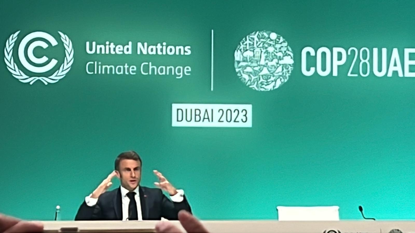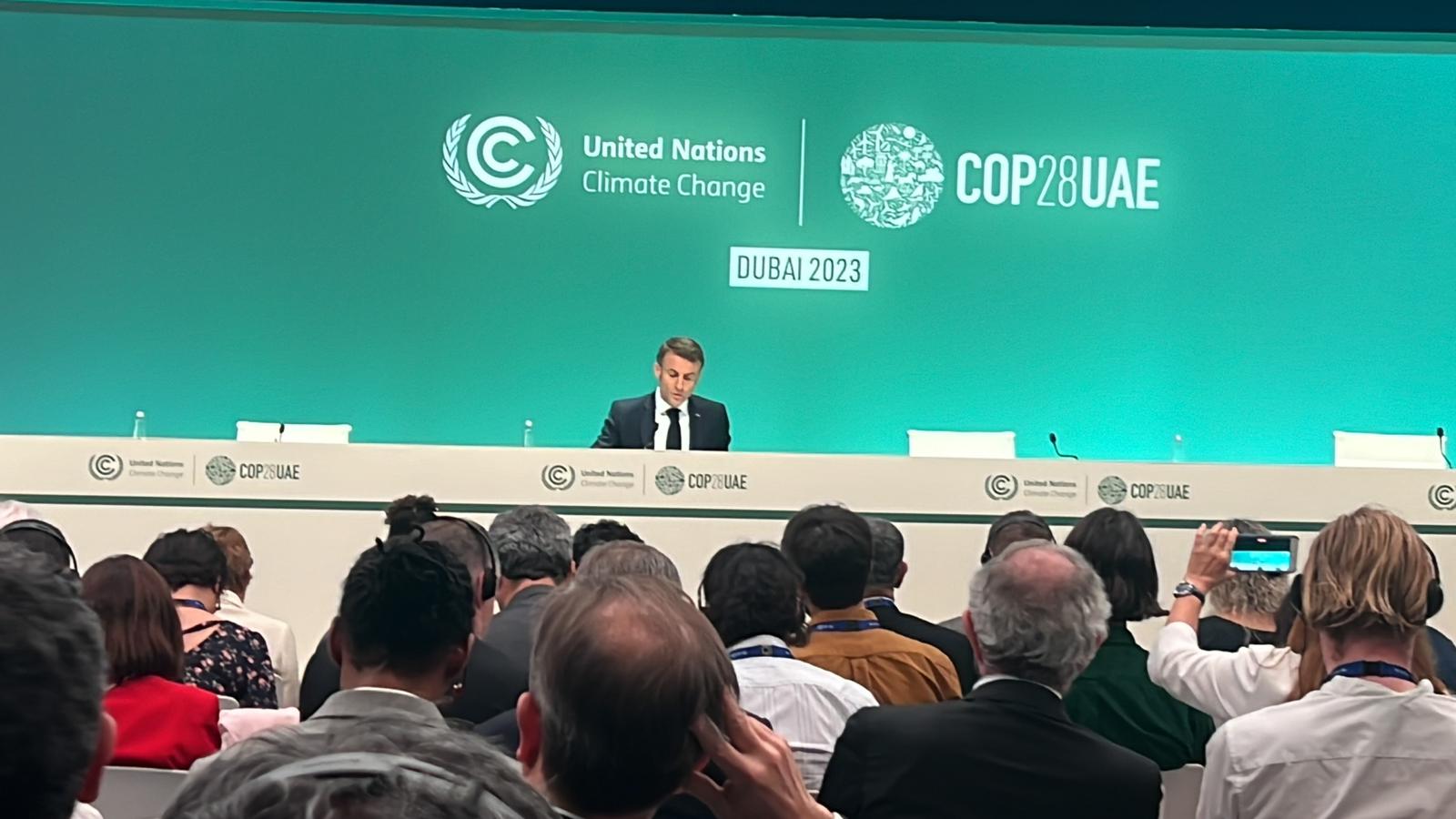 Le président français Emmanuel Macron s’exprime face aux chefs d’État et de gouvernement lors du sommet des Nations Unies sur le climat à Dubaï le 1er décembre 2023.