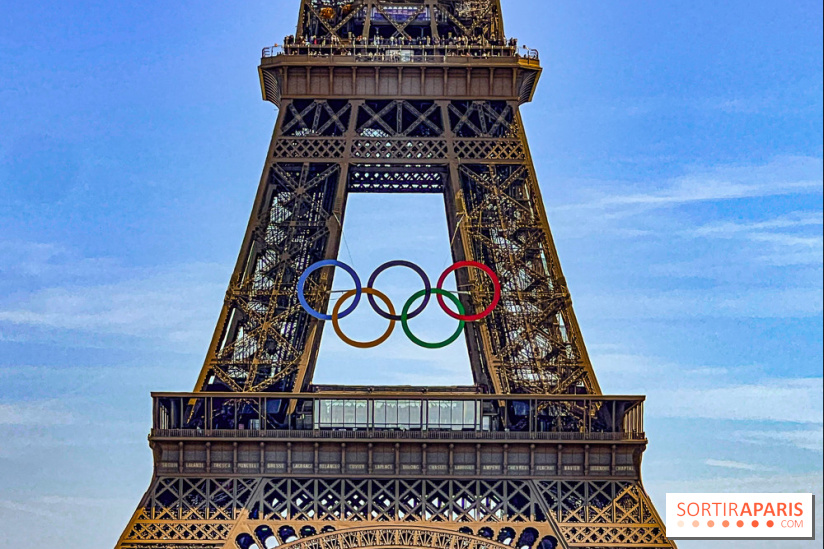 Les cinq anneaux multicolores sont installés dans l'axe de ceux accrochés à la Dame de fer sur le pont qui relie le monument parisien au Trocadéro.