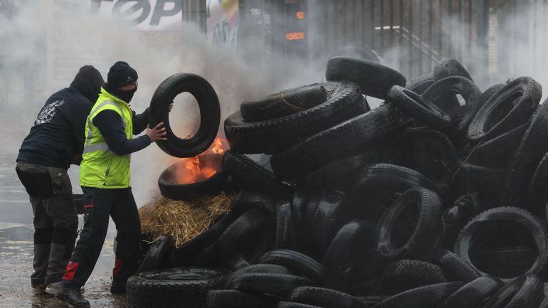 Alors que des centaines de tracteurs continuent à affluer lundi matin dans les rues du quartier européen (la police en dénombrait plus de 300 vers 08h30), le ciel s'est noirci de fumée noire près de la barricade policière principale, placée rue de la Loi aux abords du rond-point Schuman.