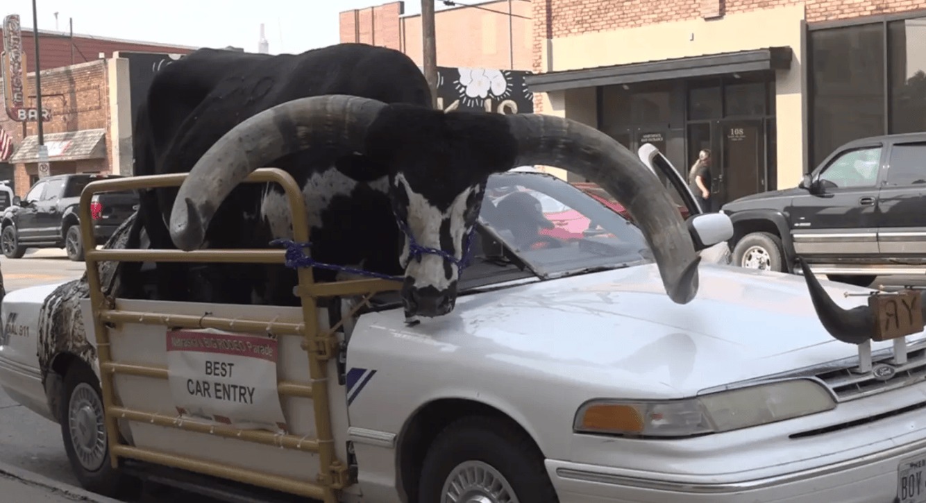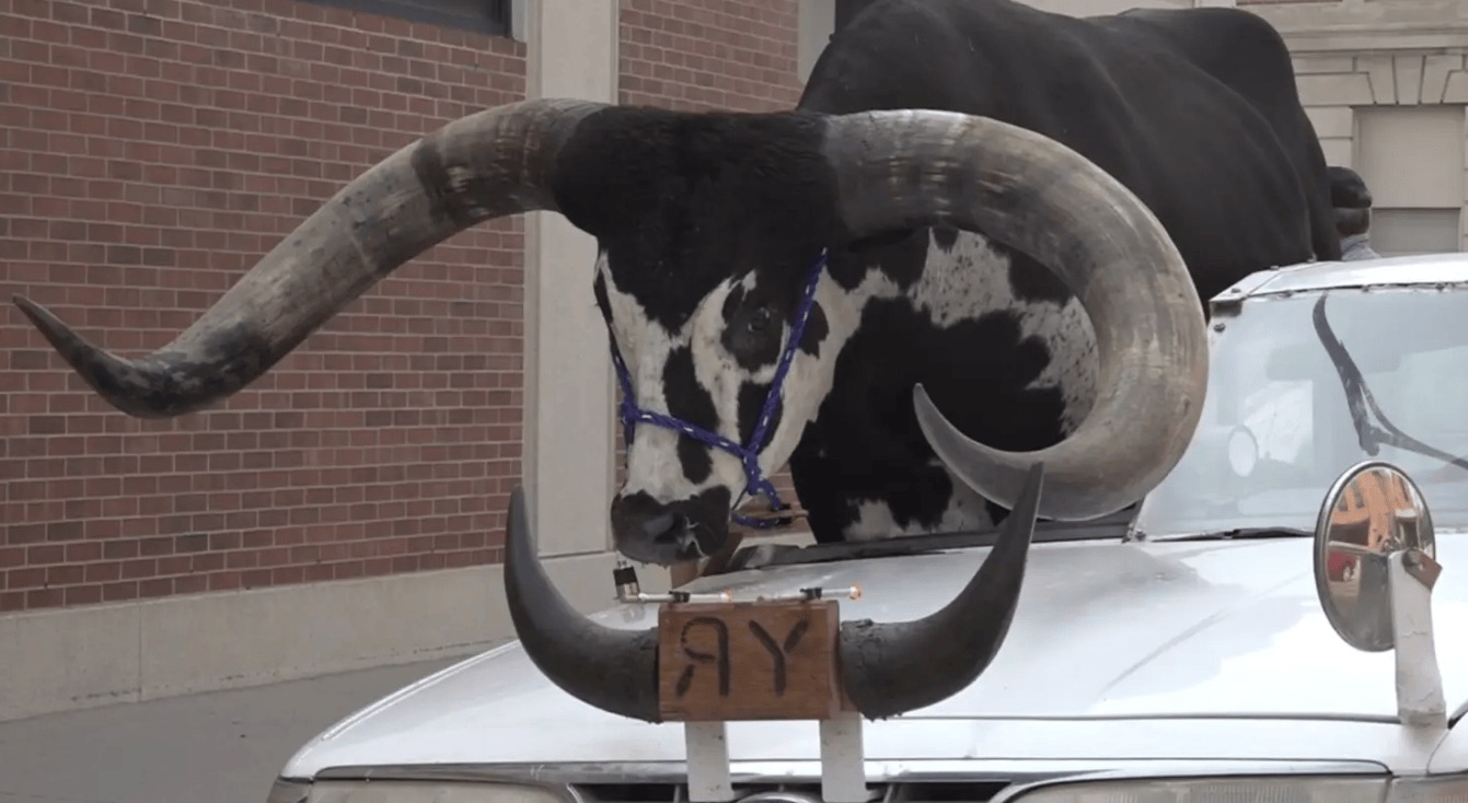 Quelque chose de petit, vraiment? En réalité, l’automobiliste en question conduisait en compagnie d’un énorme taureau watusi noir et blanc. Des photos montrent l’animal – Howdy Doody de son petit nom – se faire tranquillement promener à bord d’une voiture blanche spécialement modifiée pour lui. Les épaules, la tête et les impressionnantes cornes du bovin dominent allègrement l’endroit où se trouvait jadis la moitié du toit et du pare-brise du véhicule.